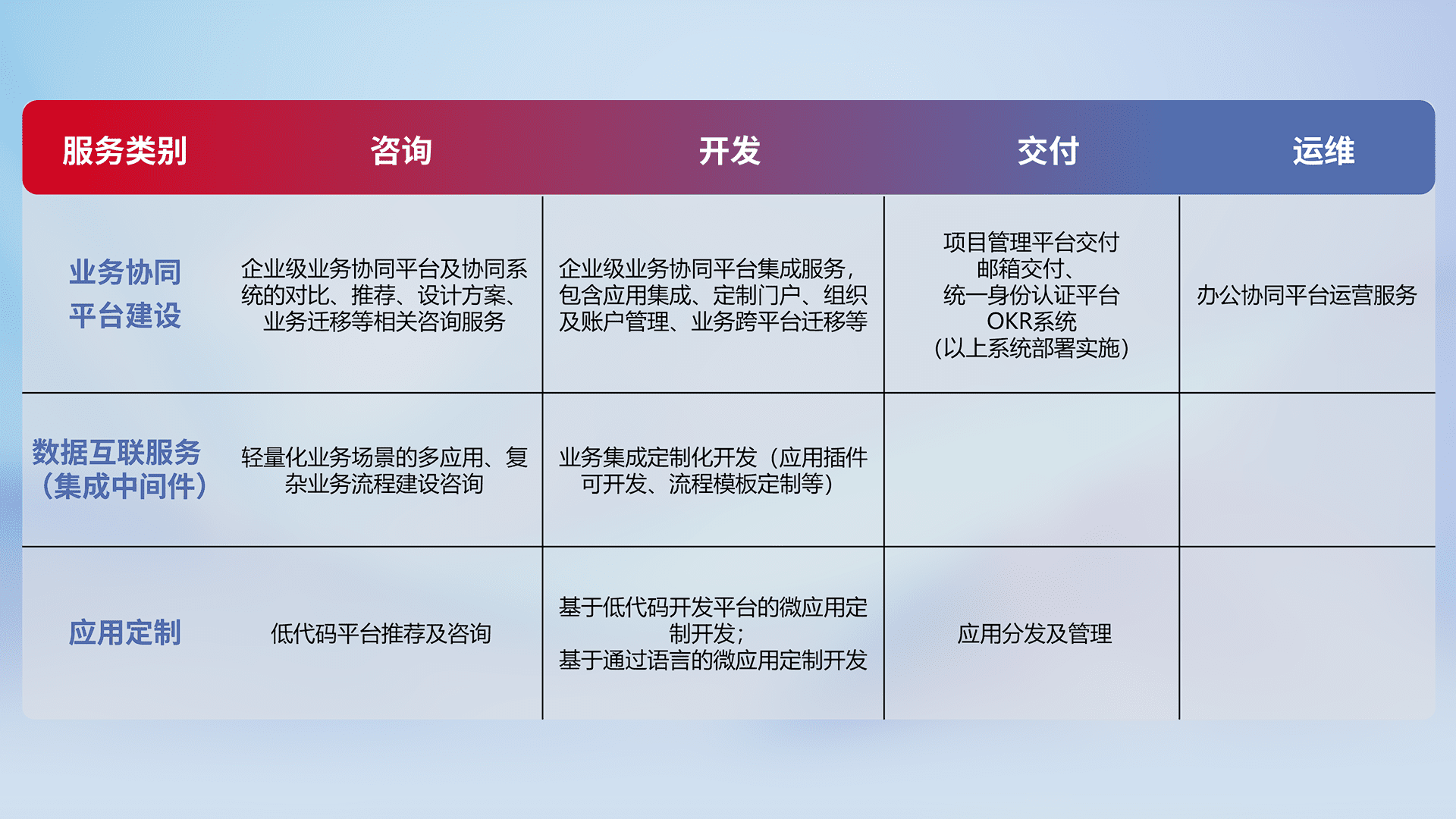 针对钉钉、、企微、、、、IDaas等平台级产品提供产品的规划、、方案、、、交付、、、定制化开发等服务,,实现如统一协同办公、、、智能客户服务、、、、混合会议管理、、、、智能数据查询、、、等业务场景,,,实现数字化转型。。。。