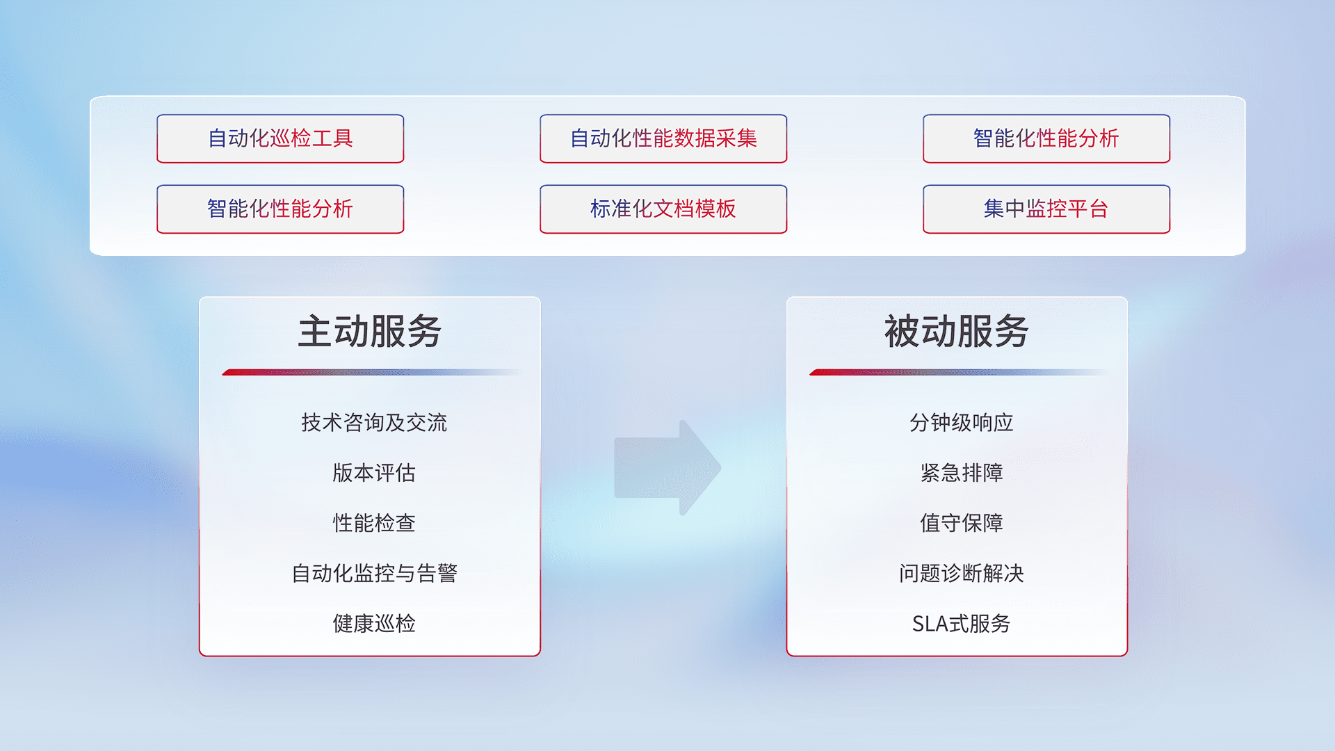 智能化工具和标准化文档,,,保障服务质量,,,提供主动服务(包含技术咨询、、、版本评估、、、、性能检查、、、、自动化监控与告警、、、、健康巡检)和被动服务包含(分钟级响应、、紧急排障、、、值守保障、、、、问题诊断解决、、SLA服务)。。。